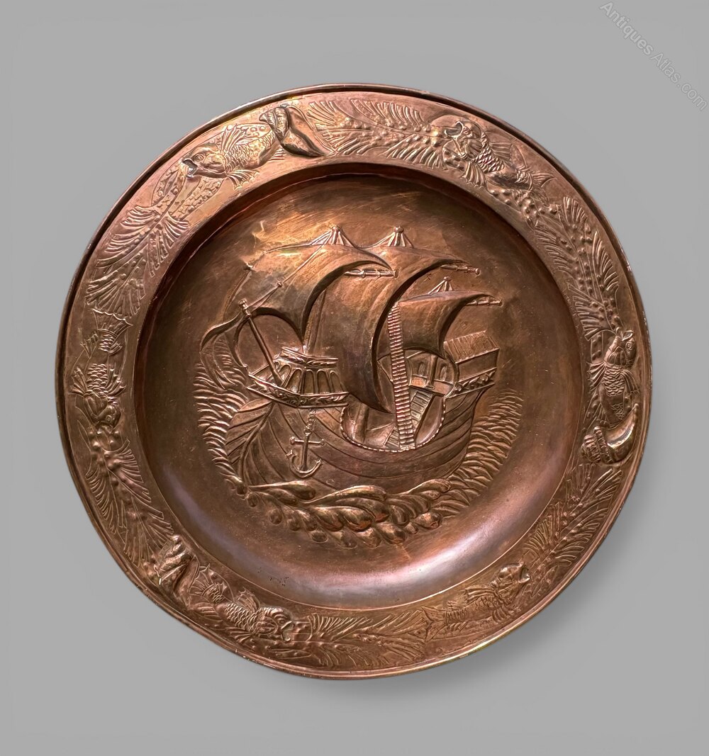 A fabulous and rare large Morecambe HEC (Home Encouragement Centre) Arts & Crafts copper charger, dating to circa 1910, and probably made by Thomas Sparks, the founder. The class at Morecambe was founded by Sparks in 1900, having previously worked at Youghal in Ireland and originally at Keswick School. Beautifully made with both the large central galleon and the vibrant fish to the border crisply executed, it is stamped to Morecambe HEC lower middle. It's a lovely piece and offered in good condition, commensurate with age, albeit there is a slight dent to the lower left edge and some light marks and spots. It displays very well. It measures 53cm diameter. The price includes UK postage.