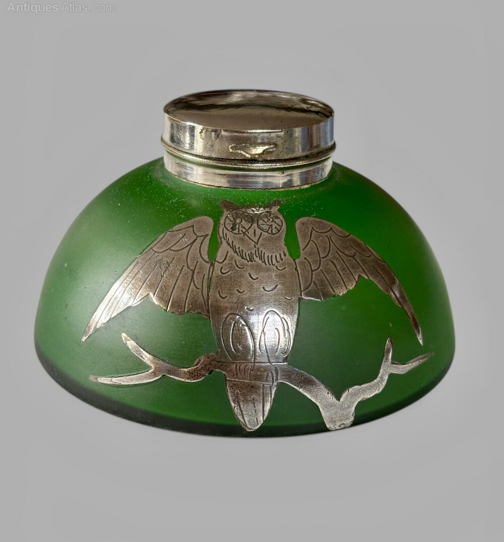 A lovely Art Nouveau opaque green glass inkwell, dating to circa 1910, with silver overlay owl to the front. A very pretty piece it is offered in pretty good condition, commensurate with age, with minor wear. There are some marks to the plated capstan top but it displays very well, and measures 8cm in diameter and 5cm tall. The price includes UK postage.