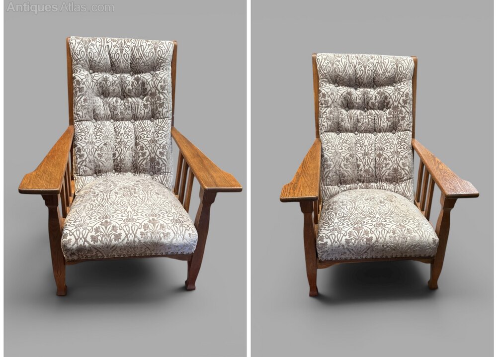 A great pair of Arts & Crafts reclining chairs, dating to circa 1910, with oak frames and wide arm rests. They have a patented reclining mechanism. The back is fixed at the top but the seats roll forward. They have recently been professionally reupholstered in a lovely Arts & Crafts pattern quality heavyweight fabric. They are strong, solid and comfortable! Offered for sale in good condition, commensurate with age, they measure 74.5cm max wide, 48cm max seat width and 95cm tall. The colour of the fabric is good - any markings shown are from shadows. They match the sofa I also have for sale and the upholstery matches the Chaise Longue I also have available. Please contact me for a delivery price.